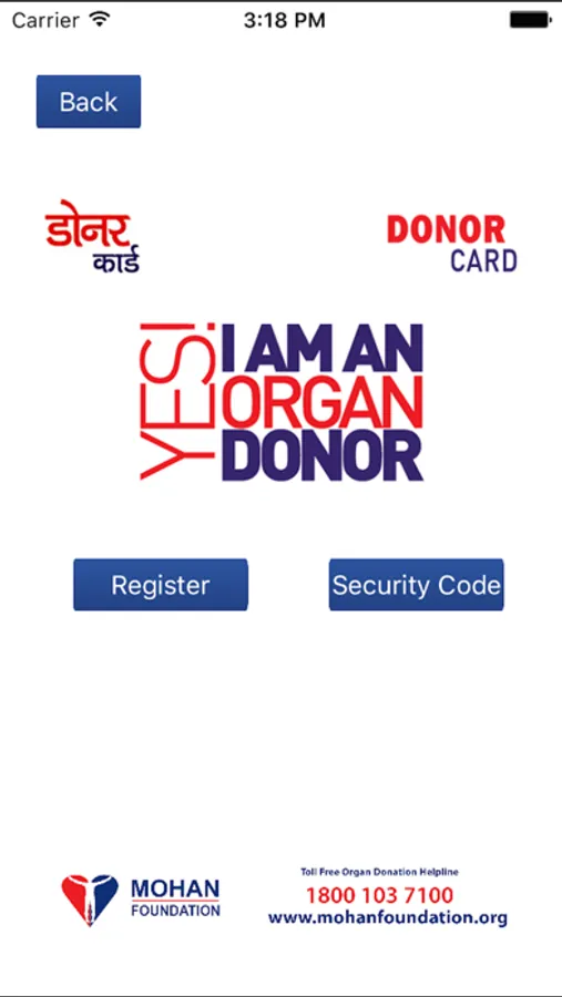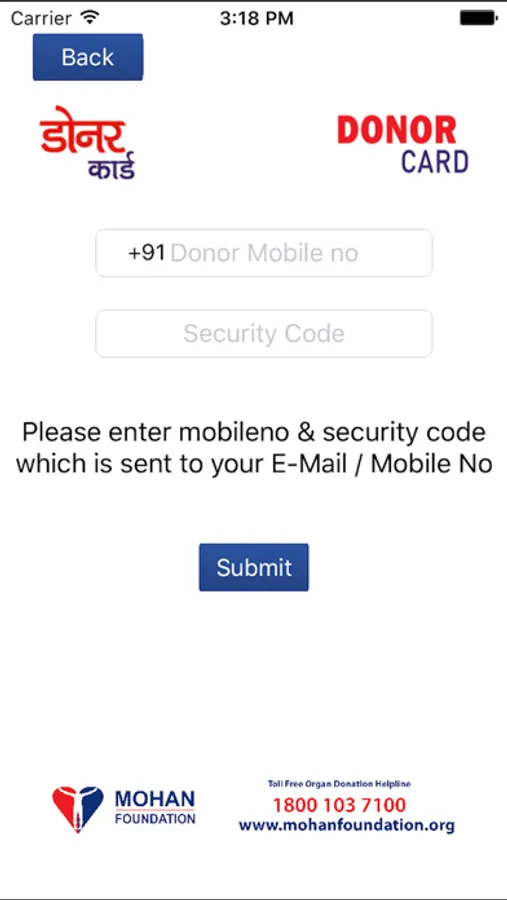 If you have previously registered as a donor on Mohan Foundation’s website (www.mohandfoundation.org) you can download your donor card information into this app, after verifying your email address and phone number. If you have not previously registered you can register as a new donor via the app. Once you are a registered user you can update your information at any time from the app, and it will be synced with the website.
