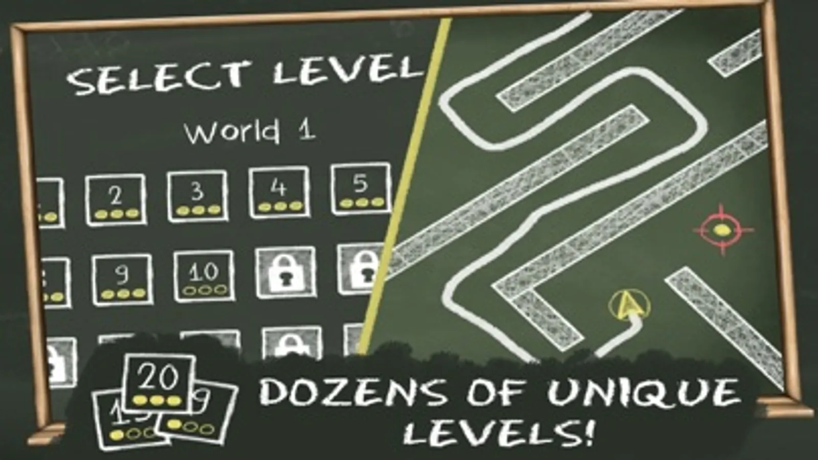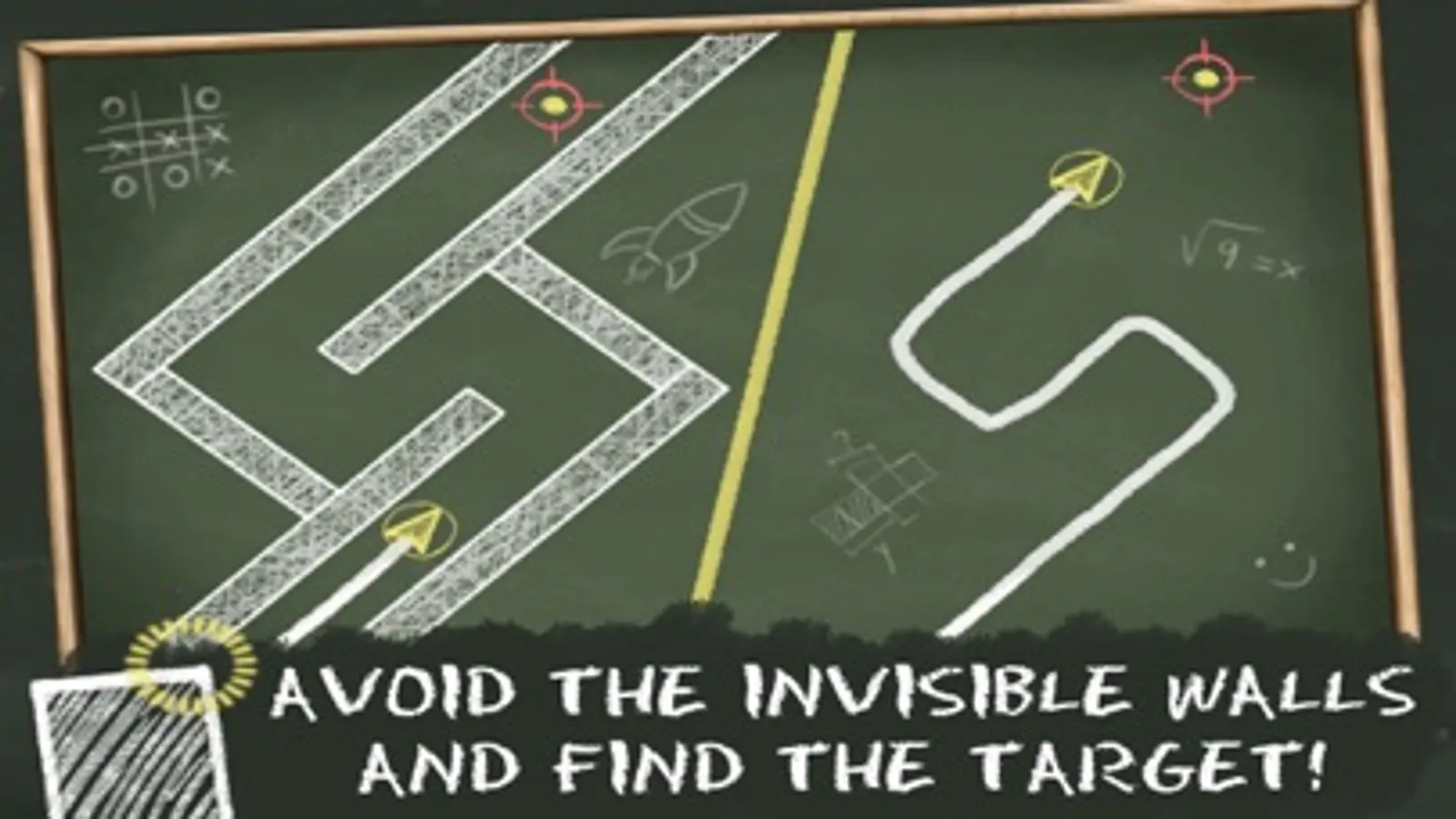 Try to solve impossible challenges using a piece of chalk on a blackboard! Use your finger to draw on the board to get stars and reach the final target! Seems easy right? Well try doing that with a board full with invisible obstacles - they only stay visible for a few seconds!