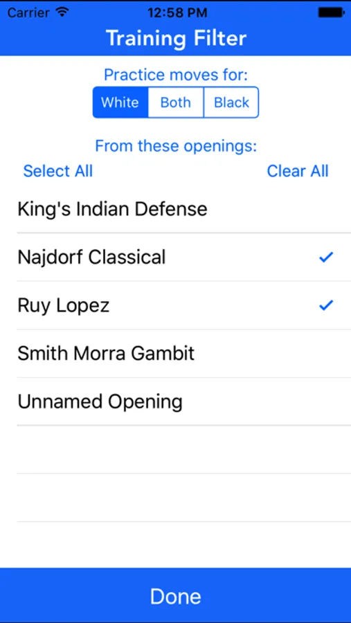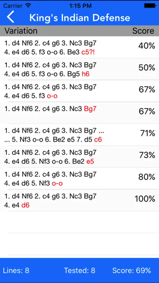 Identify openings to study by reviewing your training results. Feeling confident with certain moves? Tell Chess Arsenal to skip them while training and focus on more challenging lines.