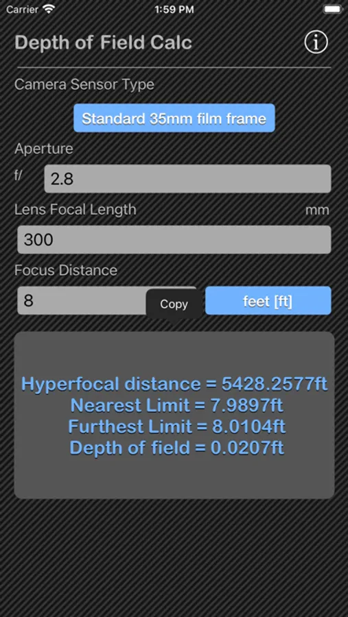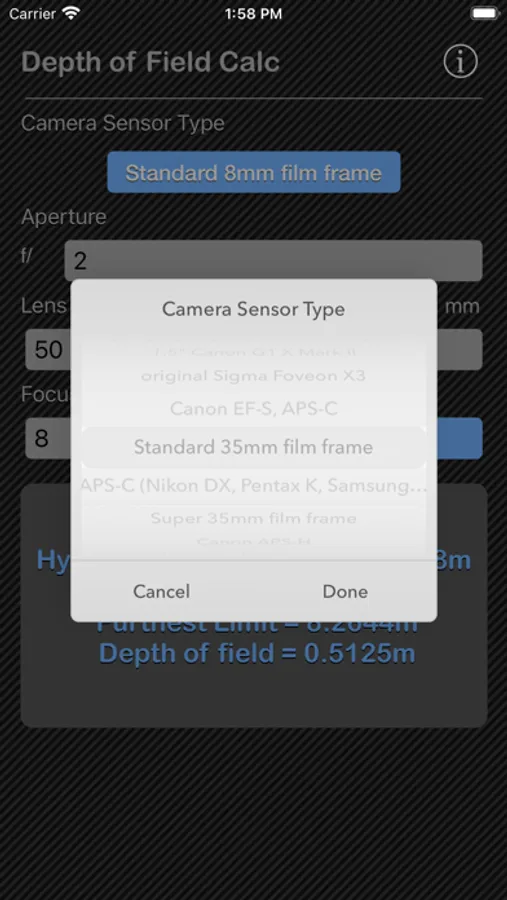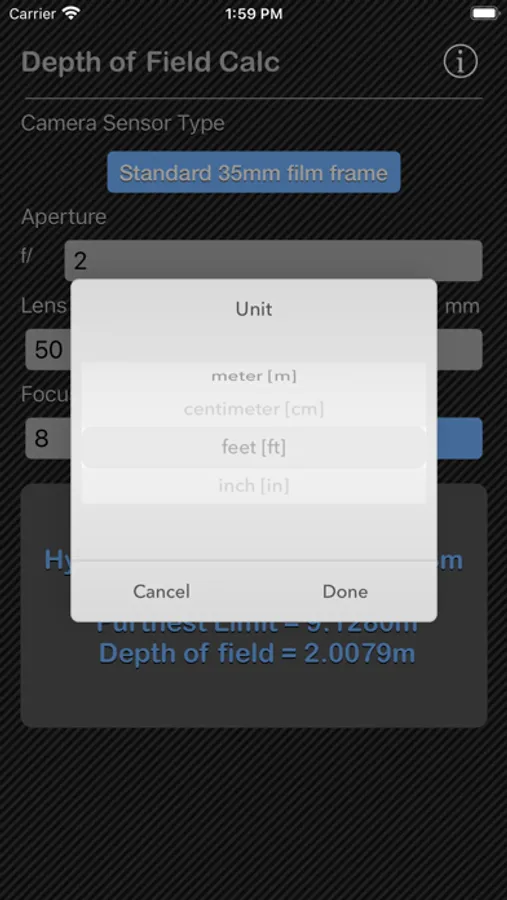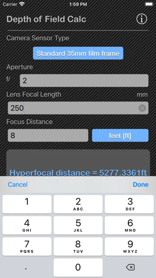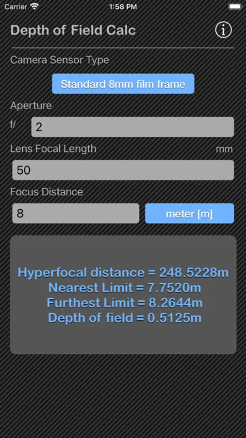 Depth of Field Calculator calculate Hyperfocal, near, and far distances and also Depth of Field value.