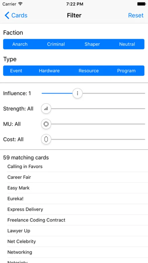 * Browse cards for your deck — filter by name, text, cost, strength, influence, type and more