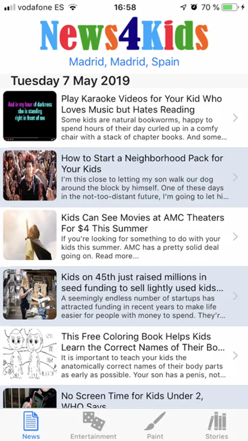 - Read news for kids based on your city, country or GPS position.