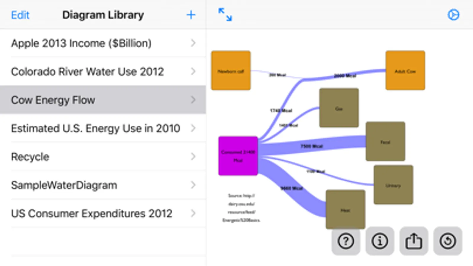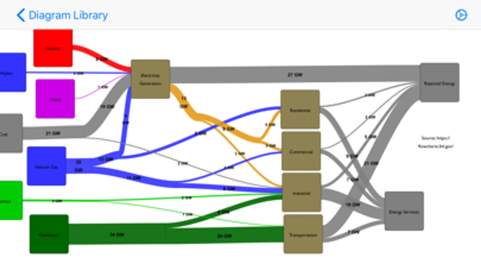 Professional drawing tool to create Sankey Diagrams. These diagrams show flows, where the width is proportional to the rate of flow. The diagrams can be created interactively, adding flow sources and sinks, moving nodes and flows around, editing colors, and more. The diagrams can be exported as a .PDF or .PNG, shared by email, messaging, and saved to the Camera Roll. A .SNK file version of your diagram can be shared by email with other Sankey Diagram app users, who will be able to load and edit the diagram. You can also create a diagram by importing a .CSV file from an email attachment or iCloud. The diagram is automatically created from the data in the spreadsheet. Edit diagrams on any of your devices using iCloud.