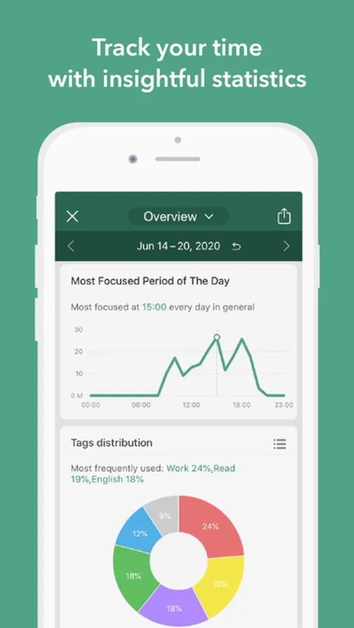 • Manage your own tags and view detailed statistics of your time distribution.