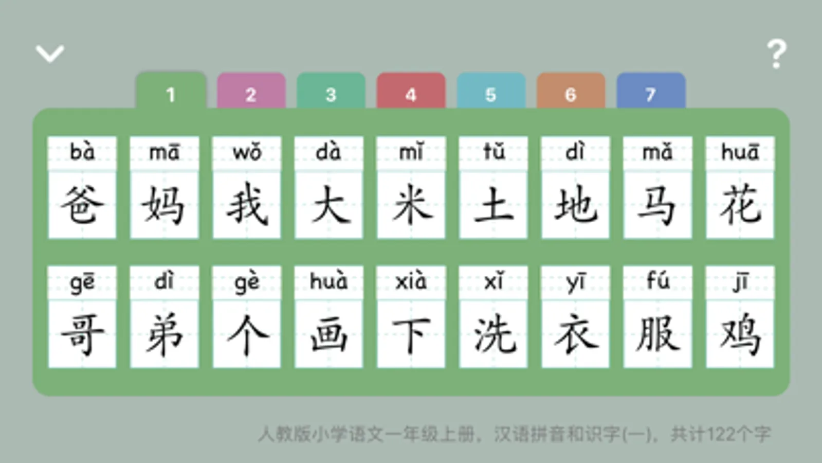 - 识字,内容涵盖”人教版“小学语文一年级上册,汉语拼音和识字(一),共计122个生字