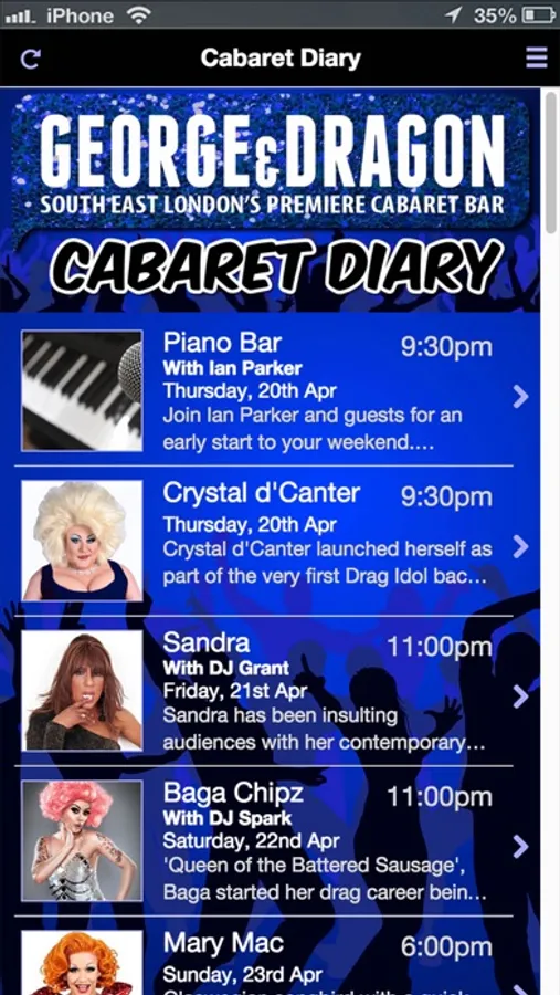 Keep up to date with what's happening at the George & Dragon cabaret bar in Greenwich. Latest listings of what's on stage, add your favourites to your calendar and a handy location map to help you find us.