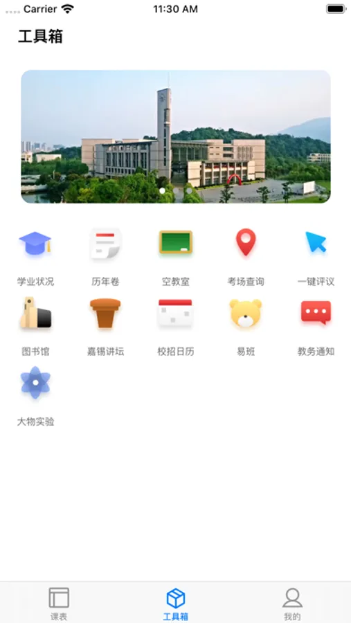 【课表】:简洁优雅的课程模块界面,灵活便利的切换方式,支持各学期切换、触发课程详情、自定义课程功能,让你的课表不再杂乱无章。