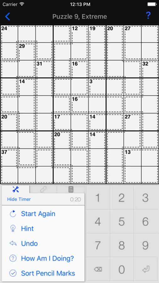 As with Sudoku, the objective of Killer Sudoku is to fill the grid with the numbers 1 to 9 such that each row, column and nonet (3x3 group of cells) contains each number only once. In addition, a Killer Sudoku grid is divided into cages, shown with dashed lines. The top-left corner of each cage shows the sum of the numbers within it. The same number cannot appear more than once in a cage.