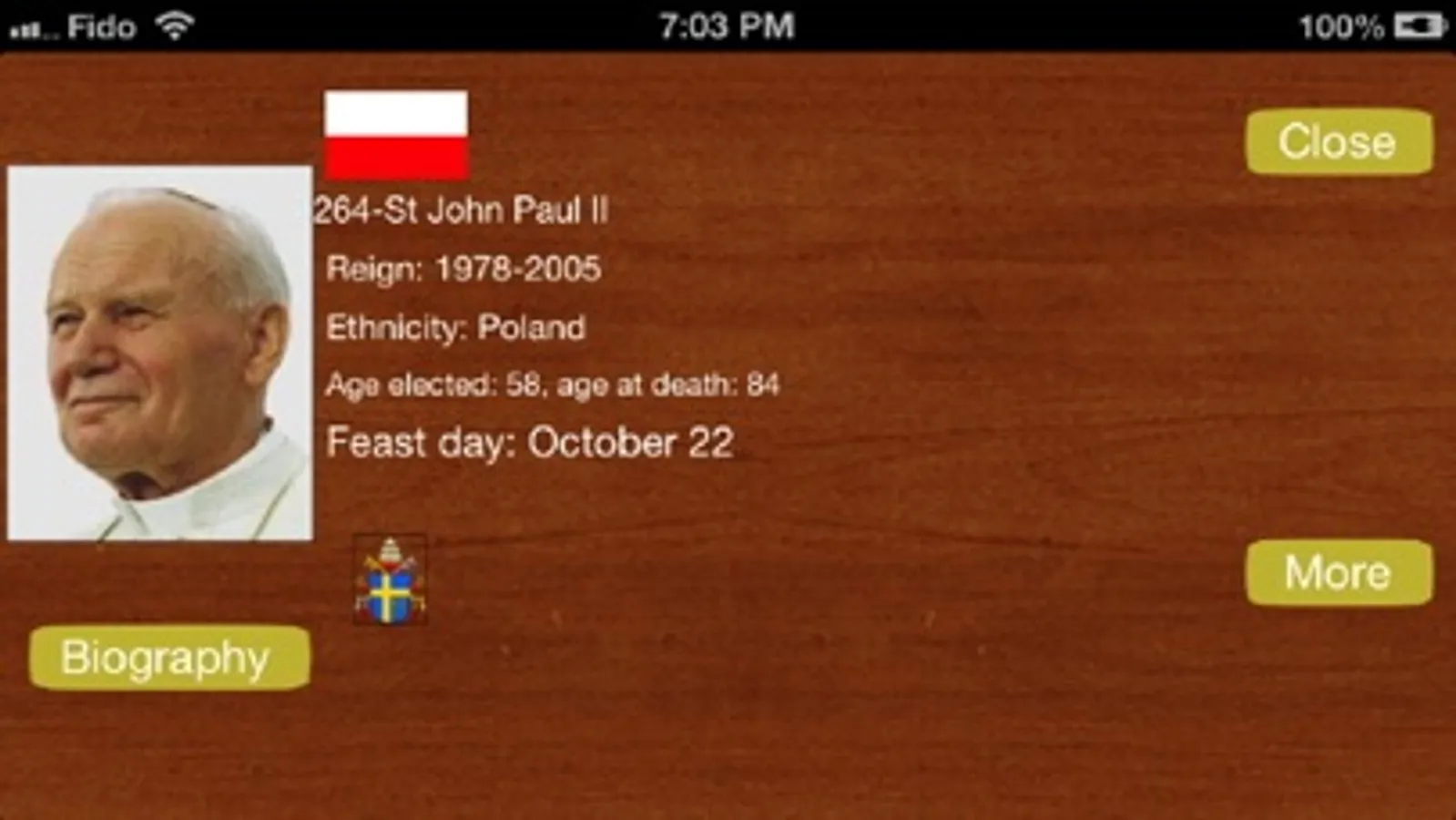 A details view is provided for every Pope, with a more button to view a more complete profile on the web.