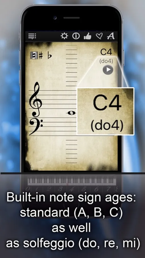 3. Built-in note sign ages: standard (A, B, C) as well as solfeggio (do, re, mi);