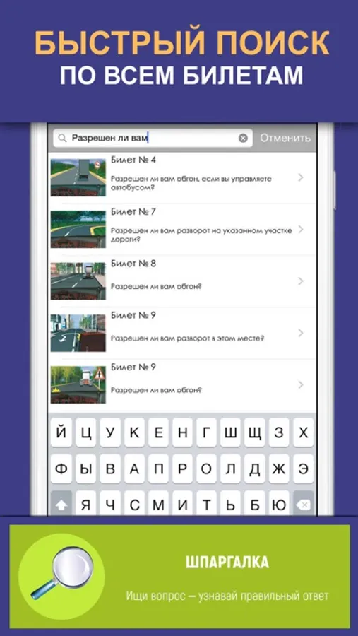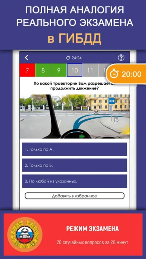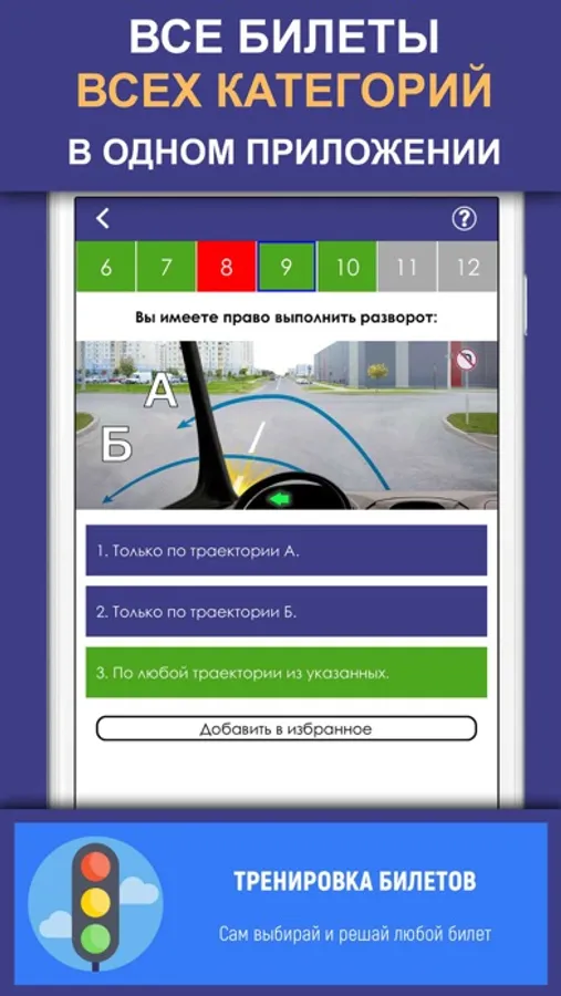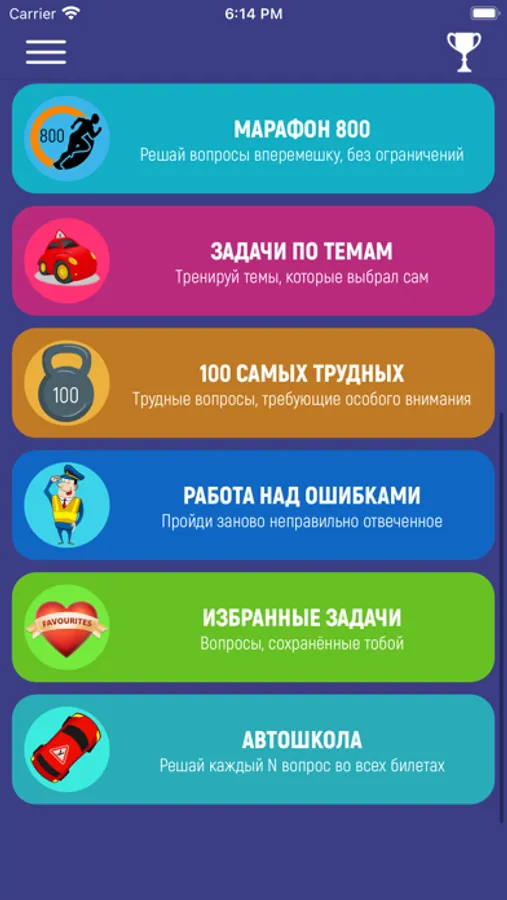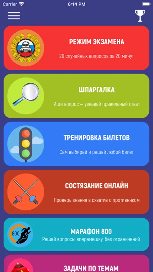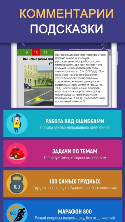 *** Режимы "Тренировка" (по билетам или по темам), "Экзамен", "Работа над ошибками", "Шпаргалка", "Избранное", "Марафон 800", "100 самых трудных", "Автошкола" и др.