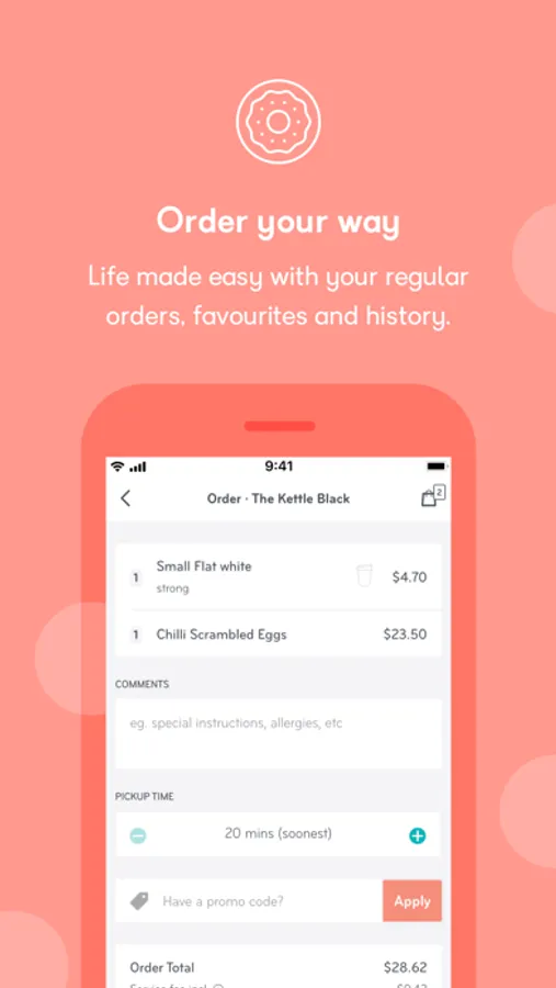 Simply select your drink and food items, or search for nearby venues and look through their menus, customise your order (1 sugar, no onion, etc), set your pick up time, confirm payment and Skip the queue!
