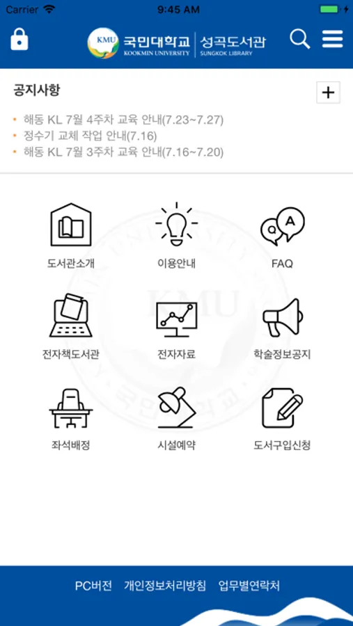 국민대학교 도서관 검색, 신간도서소개, 도서관이용안내, 공지사항 등 도서관 서비스를 제공하는 프로그램입니다.