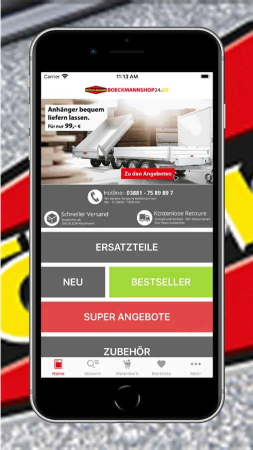 Die Boeckmannshop24 App hilft Ihnen dabei defekte Ersatzteile einfacher zu ersetzen. Sie erhalten Ihre Ersatzteile mit einem QR-Code beklebt, diesen müssen Sie dann in Zukunft nur noch scannen um das gewünschte Bauteil bequem und einfach in unserem Shop nachzubestellen. Natürlich erhalten Sie über unsere App auch Zugriff auf sämtliche anderen Services. Sie können Infos über aktuellle Anhängerpreise abrufen oder einfach ein wenig in unserem Angebot stöbern. Darüber hinaus können Sie auch Ersatzteile unserer Produktlinien fotografieren und per Telefon direkt an uns versenden. Wenn Sie Fragen zu unserer App haben, rufen Sie uns jederzeit gern unter der Telefonnummer +49 (0) 3881 75 89 89 7 an. Oder Sie schreiben uns eine E-Mail an: info@boeckmannshop24.de.