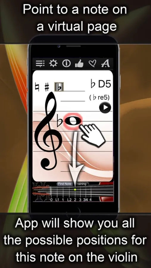 When you point to a note on a virtual page, ViolinNotesFinder will show you where this note is on a violin and the other way around, if you click violin, you will see the corresponding note and hear the sound it makes.