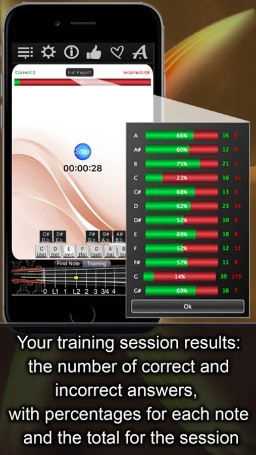 The “Notes Trainer” asks for the notes, showing you the places, and offers the full statistics to show where you are making mistakes, so you can measure progress in sight reading and see when you’ve exceeded your personal best.