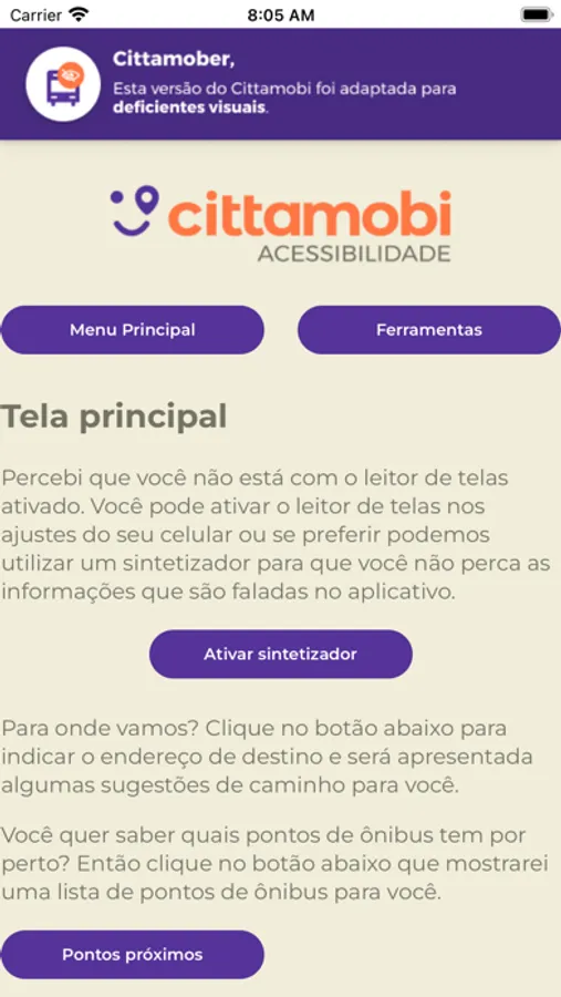 Com a versão Acessibilidade é possível consultar as previsões através do Voice Over do seu iPhone. Ele ainda te avisa automaticamente quais ônibus estão próximos do ponto selecionado.