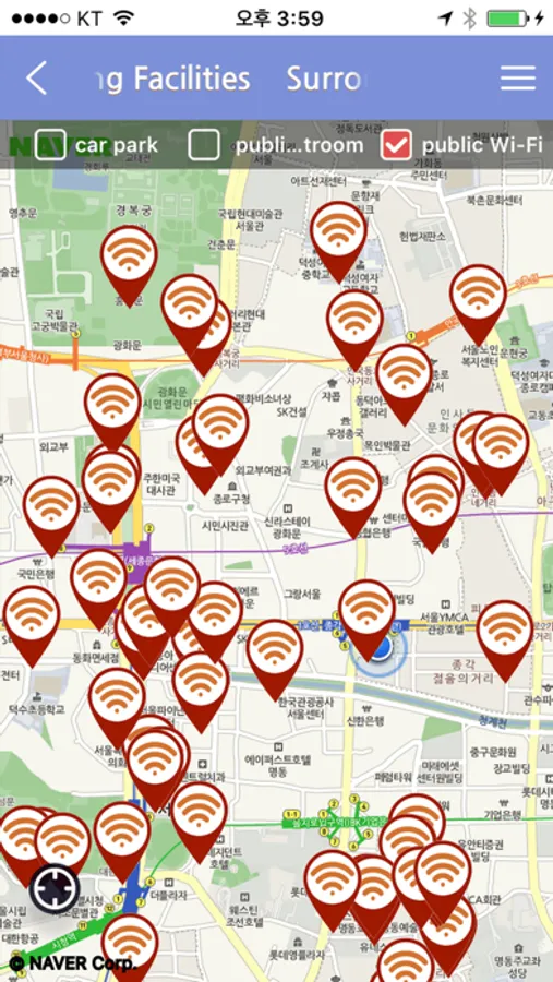 1. Seoul City Wall Map Service: It provides simplified map and Naver Map services that can link to the GPS feature of the smartphone and show you the exact locations of the points of interest and information on these areas.