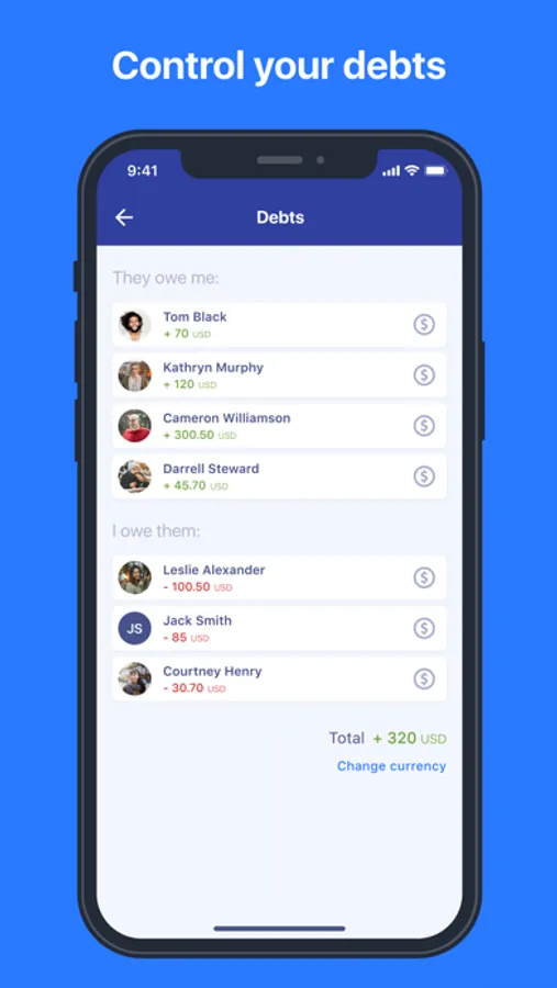 • You can see in real time the current balance of any participant, the size of debts and shares of the participants