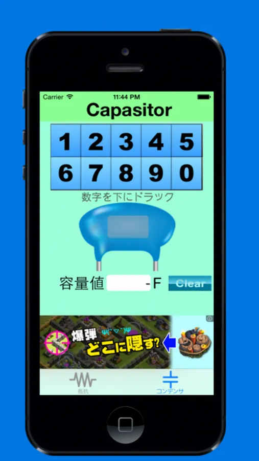 画面上部の数字から画面中央部の容量に任意の数字をドラッグ&ドロップします。コンデンサの容量値に変換します。
