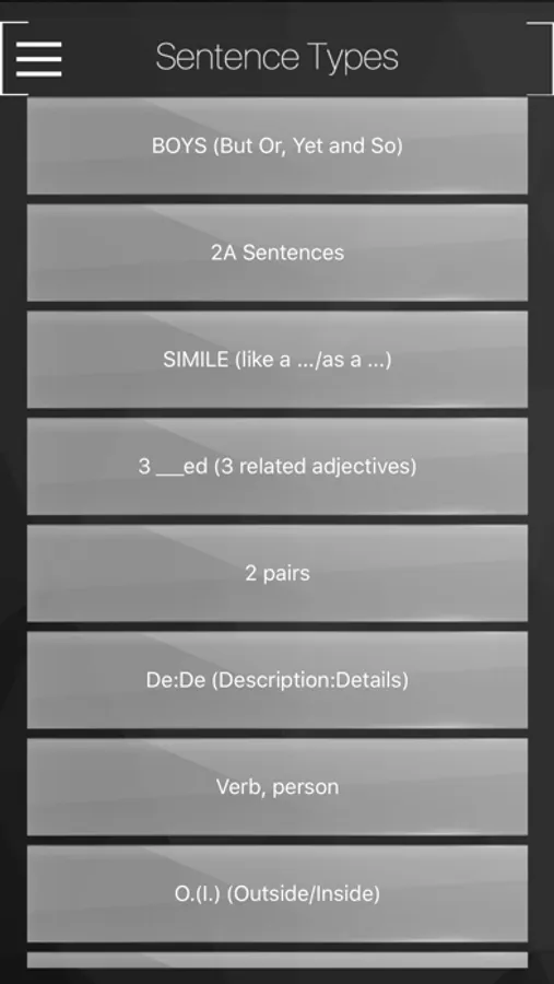 The app includes an Introduction to the sentence types with THREE sets of examples for each sentence: generic examples; genre-specific examples (both fiction and non-fiction) and Mathew Sullivan’s Introductory language/ Intermediate language/ Higher order examples.