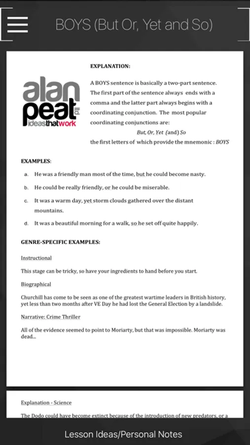 The Alan Peat Pocket App of Exciting Sentences provides teachers and parents with 25 ‘consistent-language’ sentence types, clearly explained and right there on either iPad or iPhone instantly at hand.