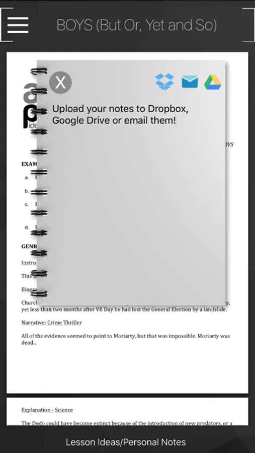 Finally the app also allows users to make and save their own personal notes/ lesson plans directly in-app. You can also back them up to Google Drive, Dropbox or email them directly from the app: three handy tools for networks of schools seeking to share ideas and planning!
