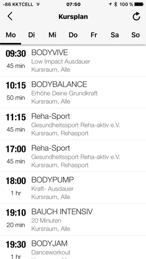 Direkter und aktueller Zugriff auf den Kursplan: Für jeden Kurs können Sie Details wie Zeit, Raum und Kursbeschreibung einsehen.