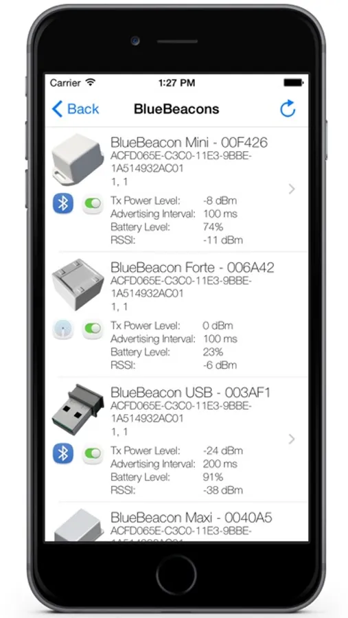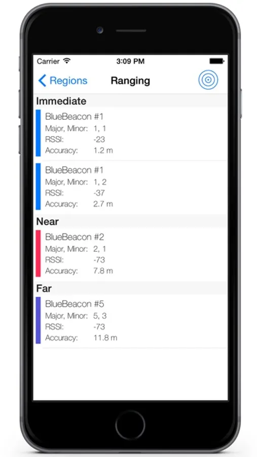 Ranging of detected BlueBeacons, showing the following information: UUID, major, minor, RSSI and accuracy.