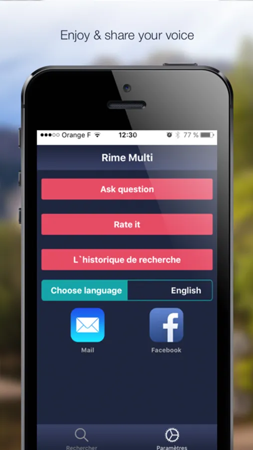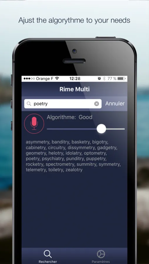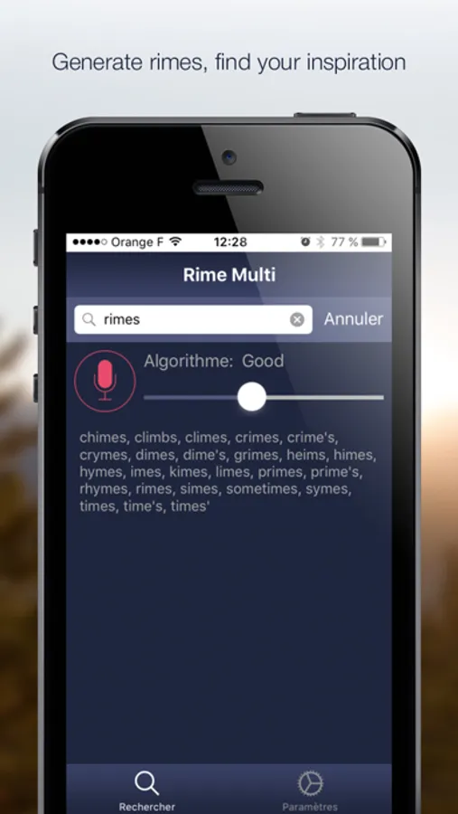 Rimes will helps you find the perfect rhymes so you have more time to spend on creation ! Whether you are writing a song or looking for inspiration in a verse, enter the word you are looking to rhyme via keyboard or voice input, and let us suggest you the best matches we've got ! Adjust the algorythm to your needs and... Create, share & amaze in 16 languages !