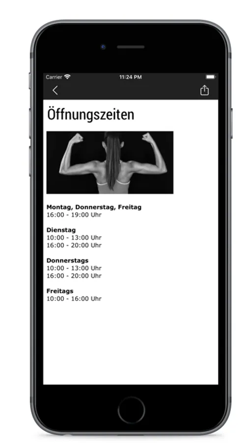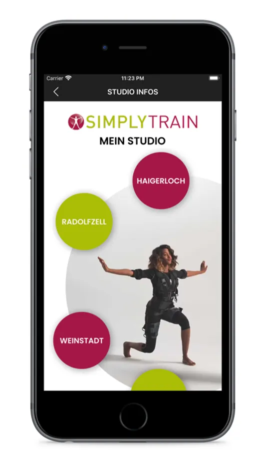 Informationen wie Öffnungszeiten, Kontaktdaten, Studiofotos und Trainingstipps sind griffbereit und können sofort per E-Mail an Freunde geschickt werden.