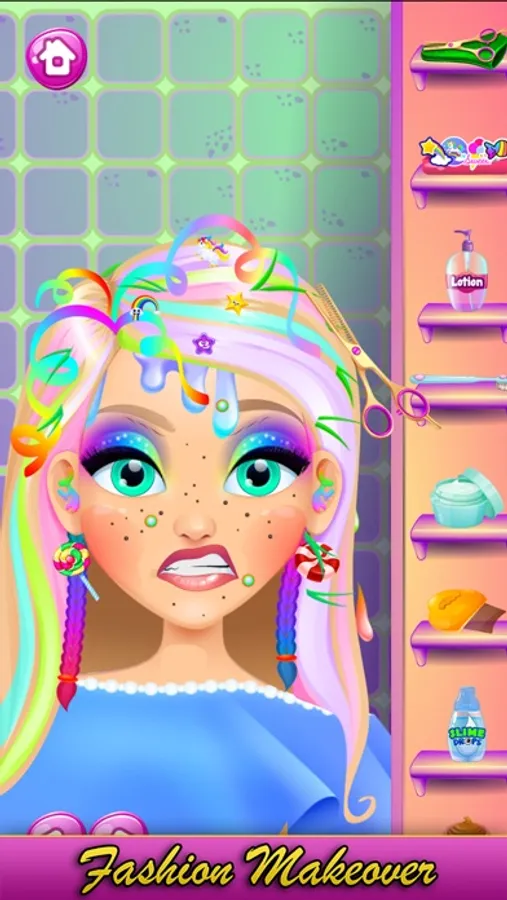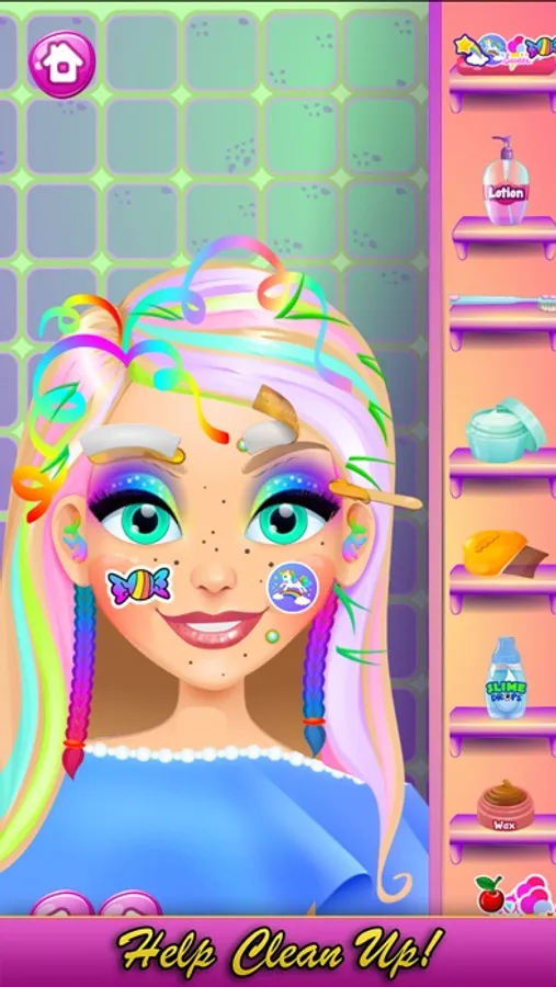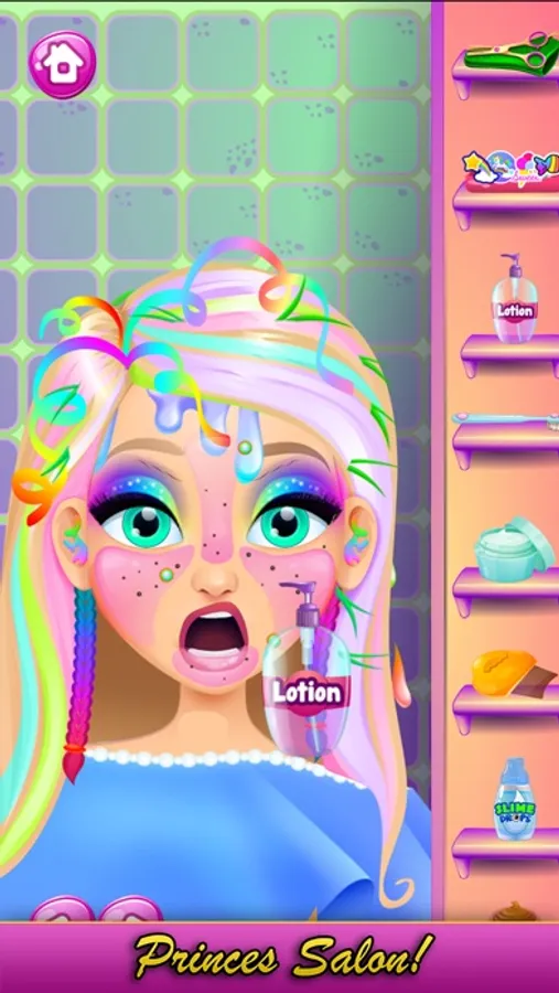 Hair Spa: Oh No! The rainbow princess needs get cleaned up at the spa and help fix make up! Use the tools on the right-side bench to remove the dirty layers & hair slime, then add fun stickers and clean the hair!