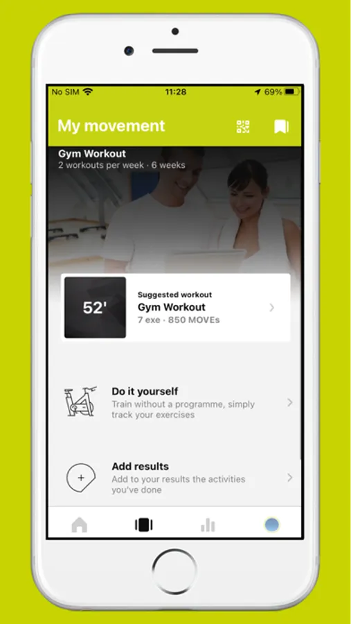 Een virtuele coach die u begeleidt tijdens uw training: Kies eenvoudig de training die u wilt doen in de Mijn beweging pagina en laat de app u begeleiden tijdens uw training. De app gaat automatisch naar de volgende oefening en geeft de mogelijkheid om uw training een waardering te geven en een volgende training in te plannen.