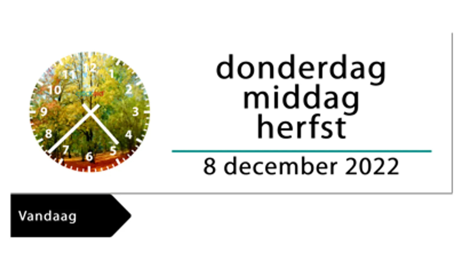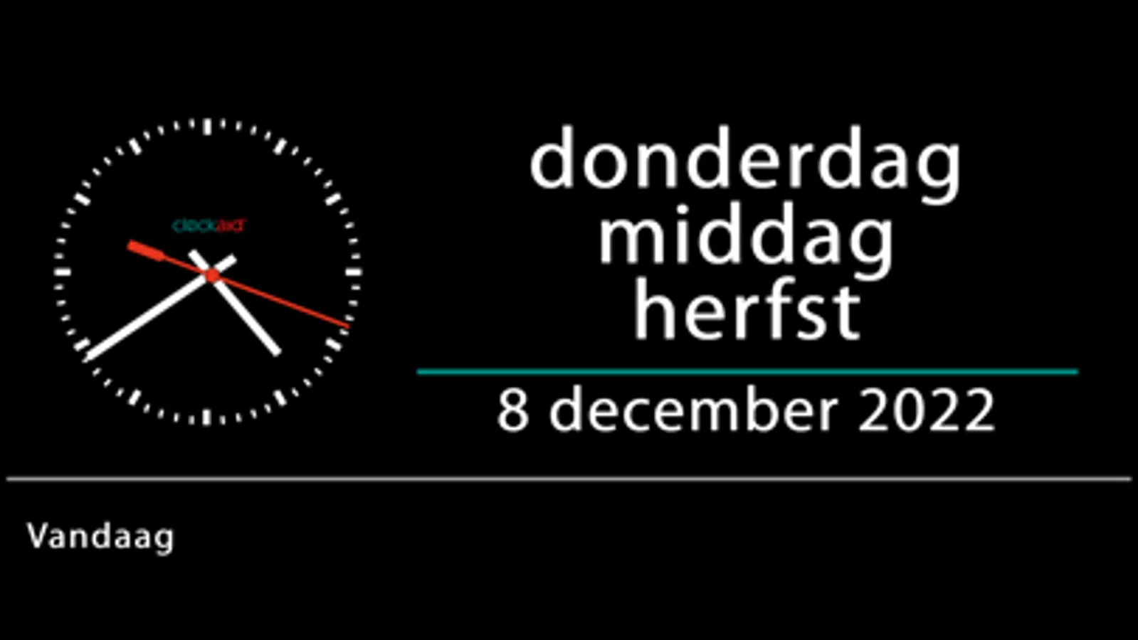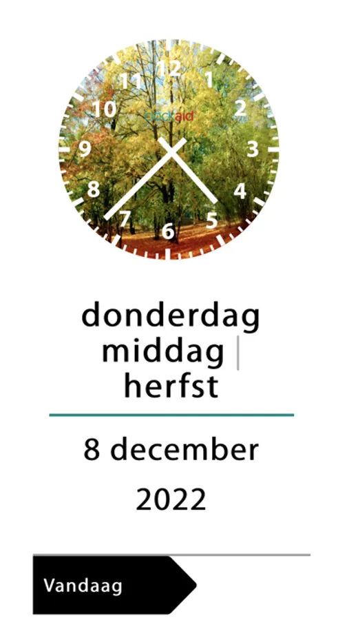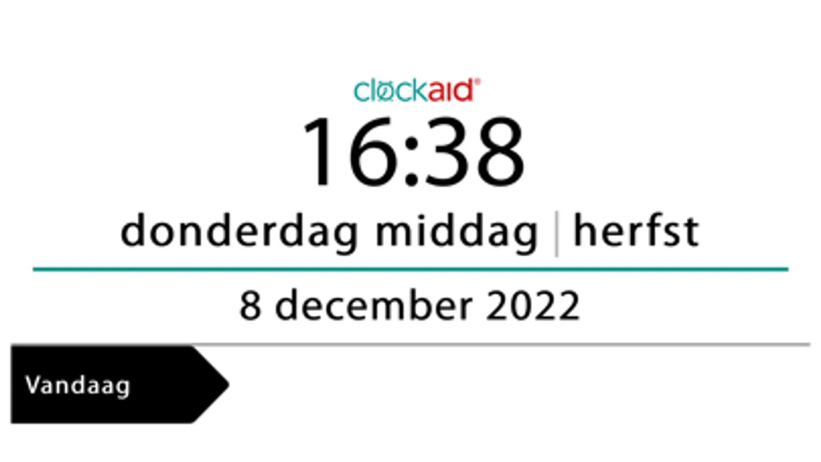 Clockaid Time shows the time (analog/digital), the day, part of the day, date, season and the weather! Available in 10 languages: NL, Eng, Du, Fr, Sp, Se, No, Fin, It.
