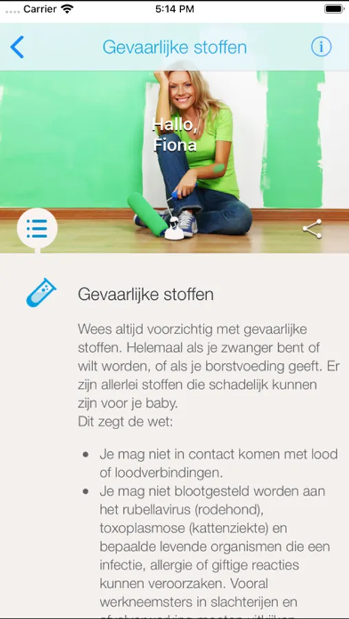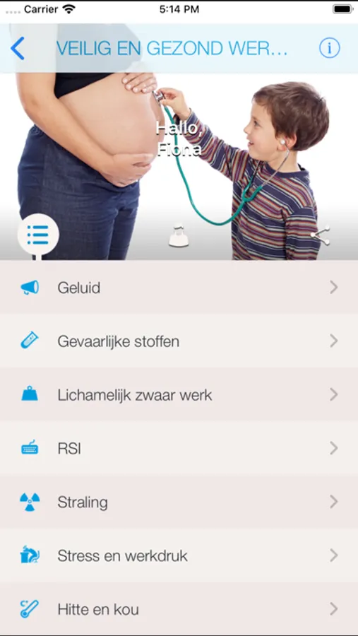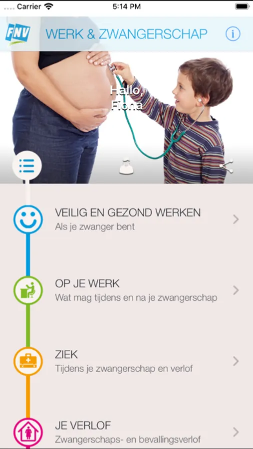 Stel dat je baas niet zo blij is met je zwangerschap? Kan hij je ontslaan? Wat voor werkzaamheden mag je nog uitvoeren? En wanneer moet je verlof aanvragen? Dit zijn voorbeelden van vragen waarop de app je een antwoord kan geven.