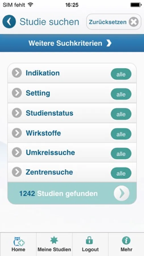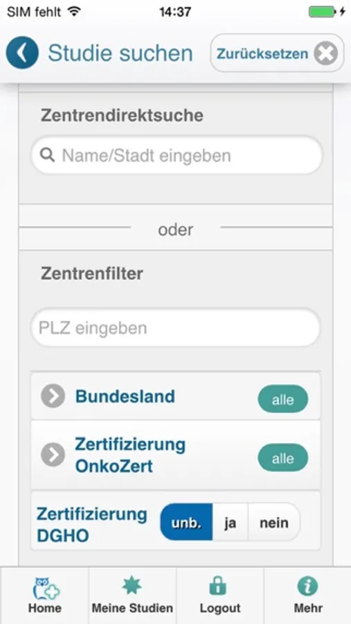 - Umkreissuche: Sie können wählen, innerhalb welchem Umkreis Studien gesucht und angezeigt werden sollen