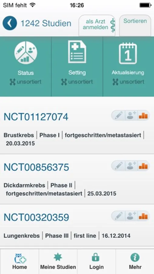 - Sortierung der gefundenen Studien nach Status, Setting und Aktualisierungsdatum