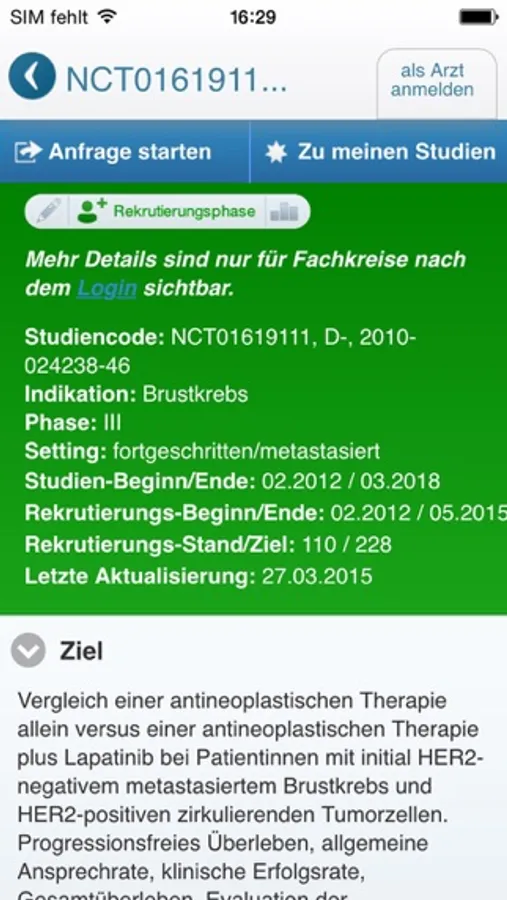 Die StudienFinder-Onkologie APP bietet eine schnelle, mobile Möglichkeit, sich eine Übersicht über rekrutierende, laufende, geplante und ausgewertete Studien der wichtigsten onkologischen Indikationen zu verschaffen. Diese kostenfreie APP richtet sich sowohl an Patienten/Betroffene als auch an Ärzte/Fachpersonal und bietet ein einzigartiges Instrument für Ihre persönliche Studiensuche. Verschiedene Filter sowie eine Direktsuche führen zu einer Liste von Studien, elektronischen Kittelkarten (eFacts), Detailinfos zur Studie (Ein-, Ausschlusskriterien, Design, Ziele, Logistik, Studienstatus, Timelines, Abstracts, Links etc.), teilnehmende Zentren und Kontaktadressen. Über eine Anfrage-Funktion können eine Studienteilnahme als Patient bzw. Zentrum oder weitere Informationen angefragt werden.