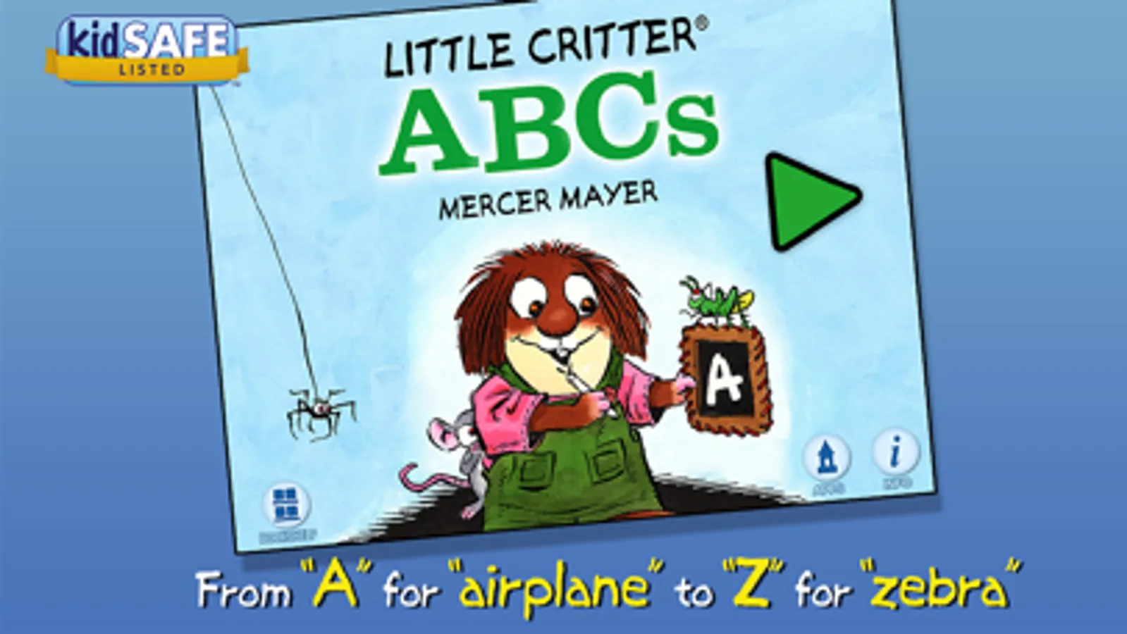 Learn your ABCs with Little Critter in this interactive board book app! Explore pictures, learn new vocabulary, and personalize the story with your own narration. From airplane to zebra and everything in between, kids will love the adorable illustrations that connect letters, words, and objects.