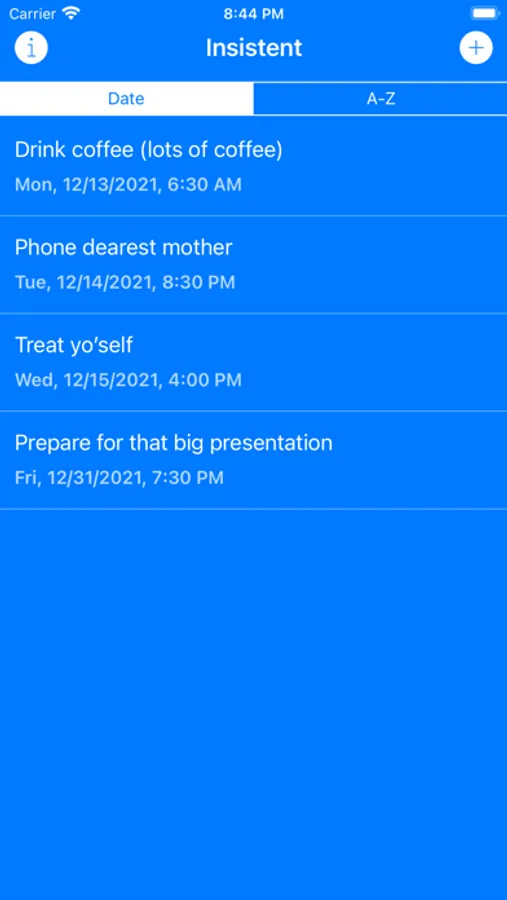 Use Insistent as a reminder for anything that you can't afford to forget; taking a pill, paying a bill, doing a chore, calling your dearest mother, you name it!