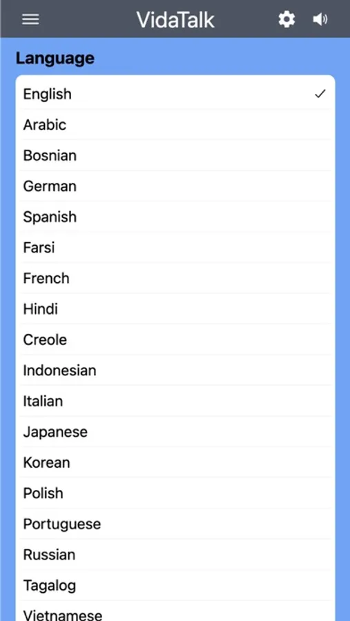 This version of VidaTalk includes English and bilingual communication with both verbal and written translation for 40 languages: Amharic, Arabic, Armenian, Bosnian, Burmese, Cantonese, Chinese, Creole, Czech, Dari, Dutch, English, Farsi, French, German, Greek, Hindi, Hmong, Indonesian, Italian, Japanese, Khmer, Korean, Lithuanian, Marshallese, Nepalese, Pashto, Polish, Portuguese, Punjabi, Russian, Somali, Spanish, Swedish, Tagalog, Thai, Tigrinya, Turkish, Ukrainian, and Vietnamese.