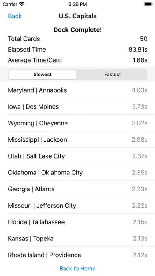 The app counts the time spent on each question/answer card and shows the results at the end. You can sort your results by fastest or slowest times to see where you need to improve.