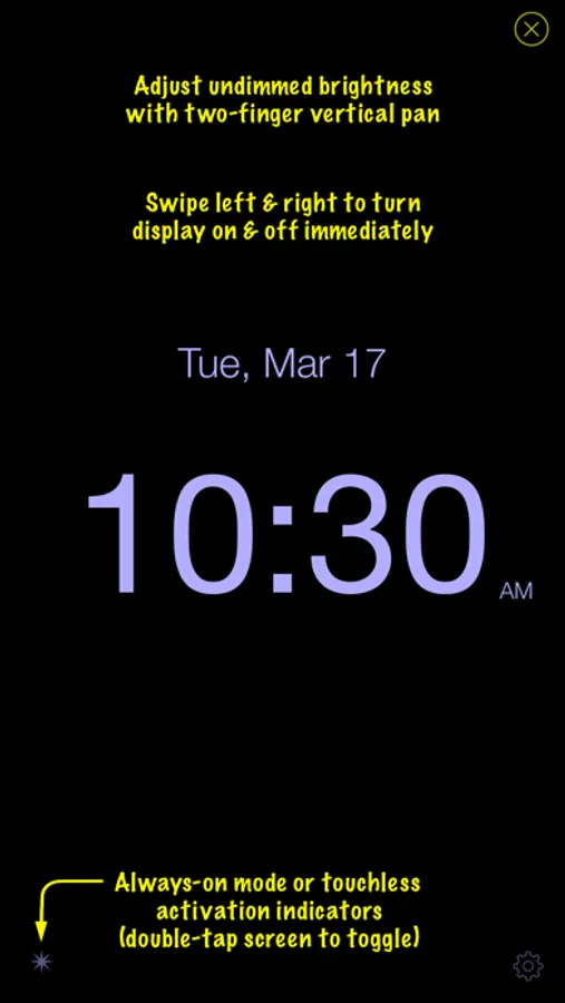 Touch the screen to check the time, which will again disappear after the adjustable interval. On iPhones in portrait orientation, you don't have to touch the screen to see the time. Simply wave your hand in front of the screen to activate the iPhone's proximity detector and the time display! Or, on all devices, enable adaptive vibration sensing to activate the display with a touch to your nightstand or even a footstep on your floor.