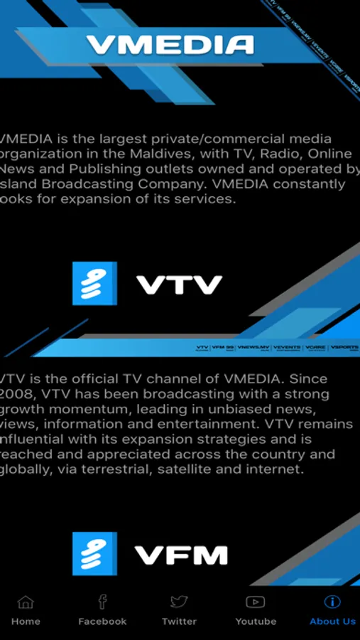 VMedia is the largest private/commercial media organization in the Maldives, with TV, Radio & Online. vMedia is owned and operated by Island Broadcasting Company. Its broadcasting channels cover 95% of the country. VTV and VFM99 broadcast contents mainly in the local language – Dhivehi. vNews.mv is the online news website which delivers update news both in English and Dhivehi. vMedia constantly looks for expansion of its services. Keep enjoying vMedia..