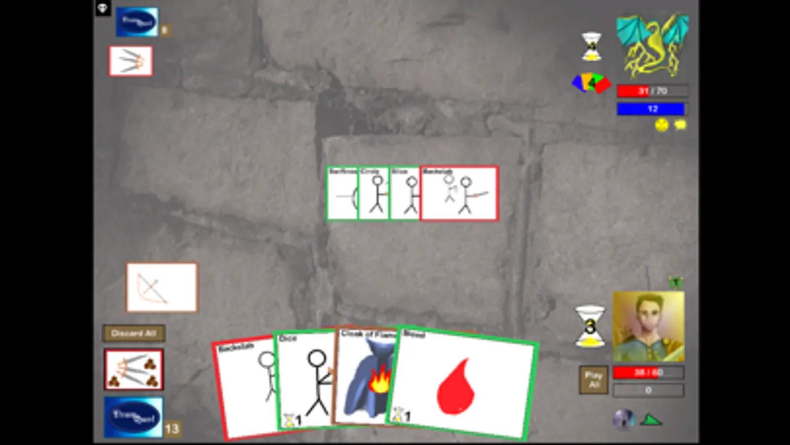 Combat is a card game. Your abilities are a deck of cards that you develop as you gain power. For example, a thief starts with a handful of Slice cards and a Backstab, but can learn defensive moves like Dodge or powerful finishing moves like Coup de Grace. Carefully choosing which cards to add to your deck is the heart of the game: wise choices will find you slicing through monsters while poor ones will leave you tripping over your own two feet.
