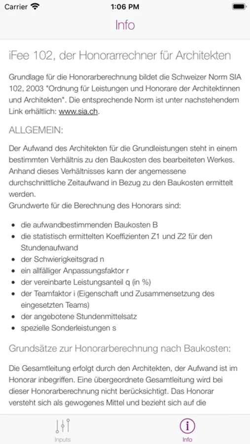Grundlage für die Honorarberechnung bildet die Schweizer Norm SIA 102, 2003 „Ordnung für Leistungen und Honorare der Architektinnen und Architekten“. Die entsprechende Norm ist erhältlich unter www.sia.ch.
