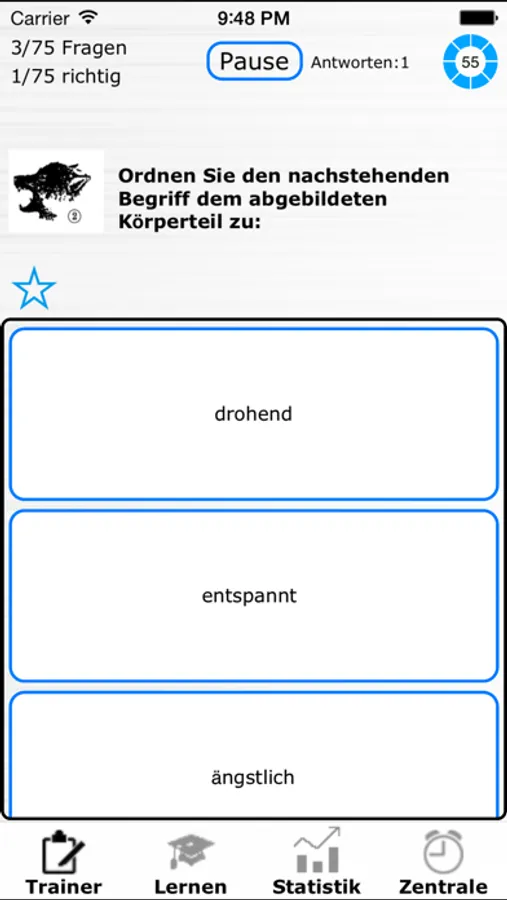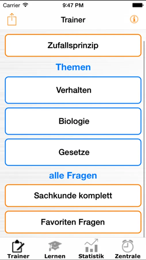 Der Sachkunde Trainer beinhaltet alle aktuellen und offiziellen Prüfungsfragen für den Sachkundenachweis des Landeshundegesetzes. In unserem Trainer Modus, haben Sie die Wahl einzelne Themengebiete gezielt zu lernen oder sich per Zufall aus allen 3 Themen einer Prüfungssimulation zu stellen. Sie können Ihre Geschwindigkeit selbst bestimmen, um sich so perfekt auf Ihre Prüfung vorzubereiten. Am Ende der Trainingseinheit haben Sie die Möglichkeit die nicht richtig beantworteten Fragen noch einmal zu wiederholen. Speichern Sie die Fragen als Favorit, die Sie als besonders schwierig empfinden und nutzen Sie die graphischen Statistiken um Ihren Lernfortschritt optisch zu erfassen.