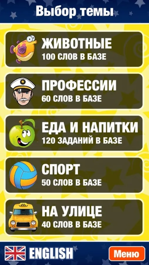 Первый этап называется "Карточки" и служит для запоминания новых слов. Каждая карточка включает в себя картинку и кнопку с произношением слова.