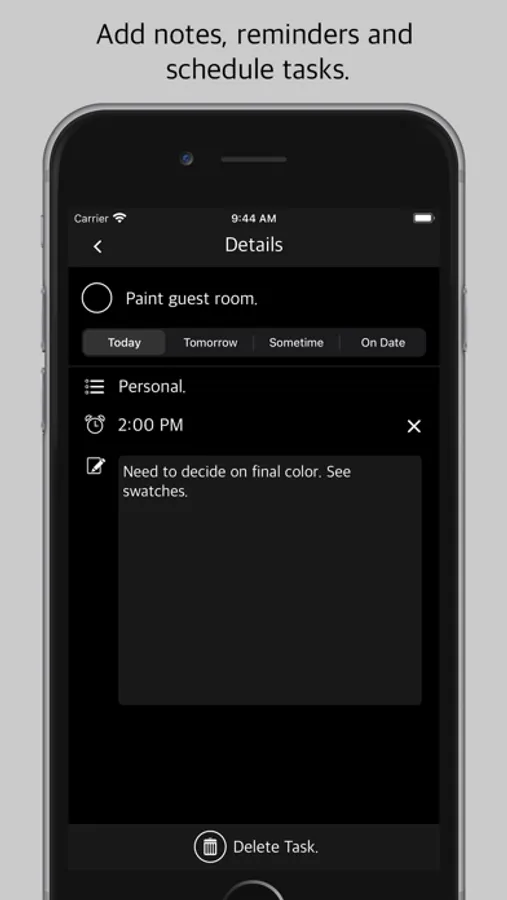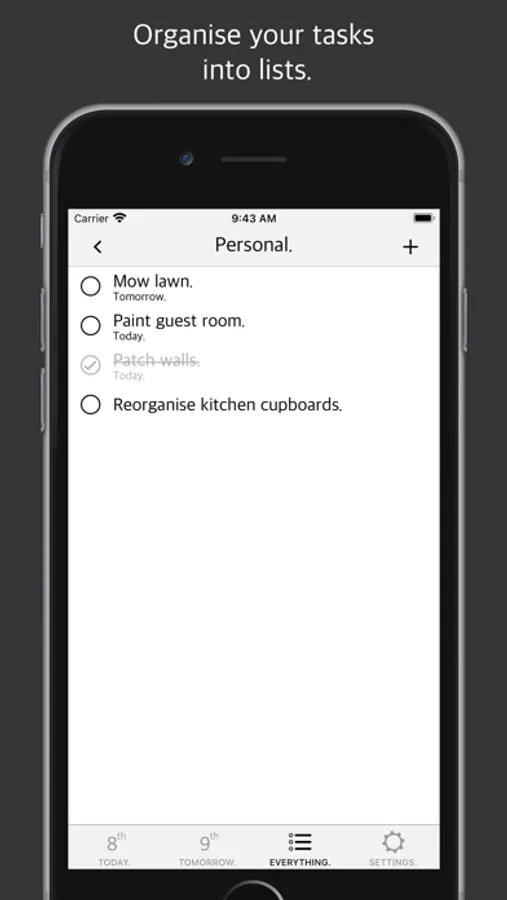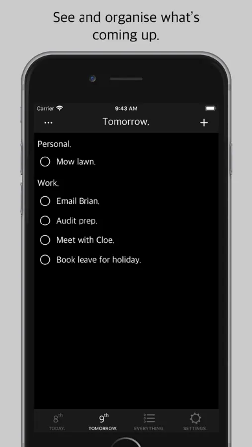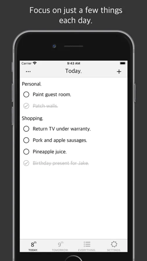 A large list of things to do can be daunting. To Do Today allows you to focus on just a few - whatever half-handful of things you want to complete today - allowing you to chip away at your tasks steadily rather than give up under the dispiriting weight of the master list. Swipe to assign tasks to be done tomorrow or today, set them to a specific date some time down the line or relegate them to be done someday. (You know, when you get around to it.)