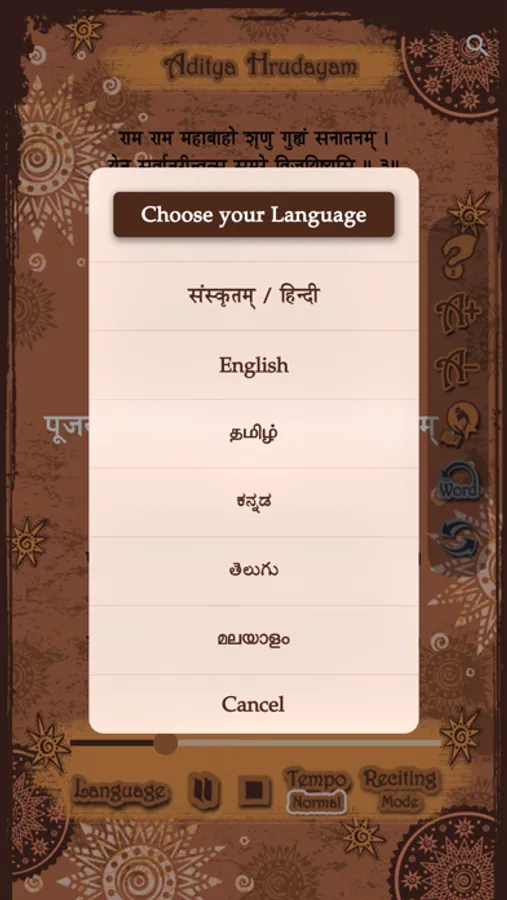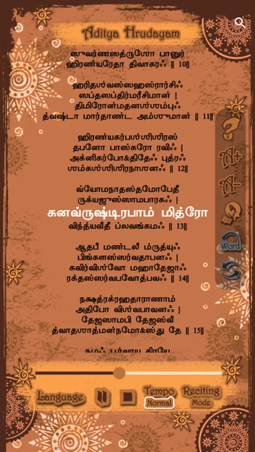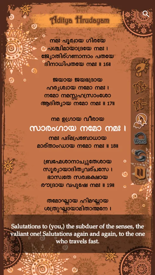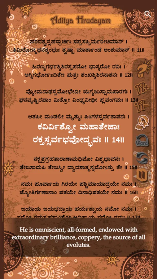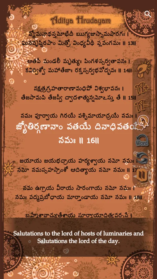 2. Multi language support for Adithya hridayam stotram in Telugu, Hindi, Sanskrit, English, Tamil, Kannada, Malayalam and more to be included.